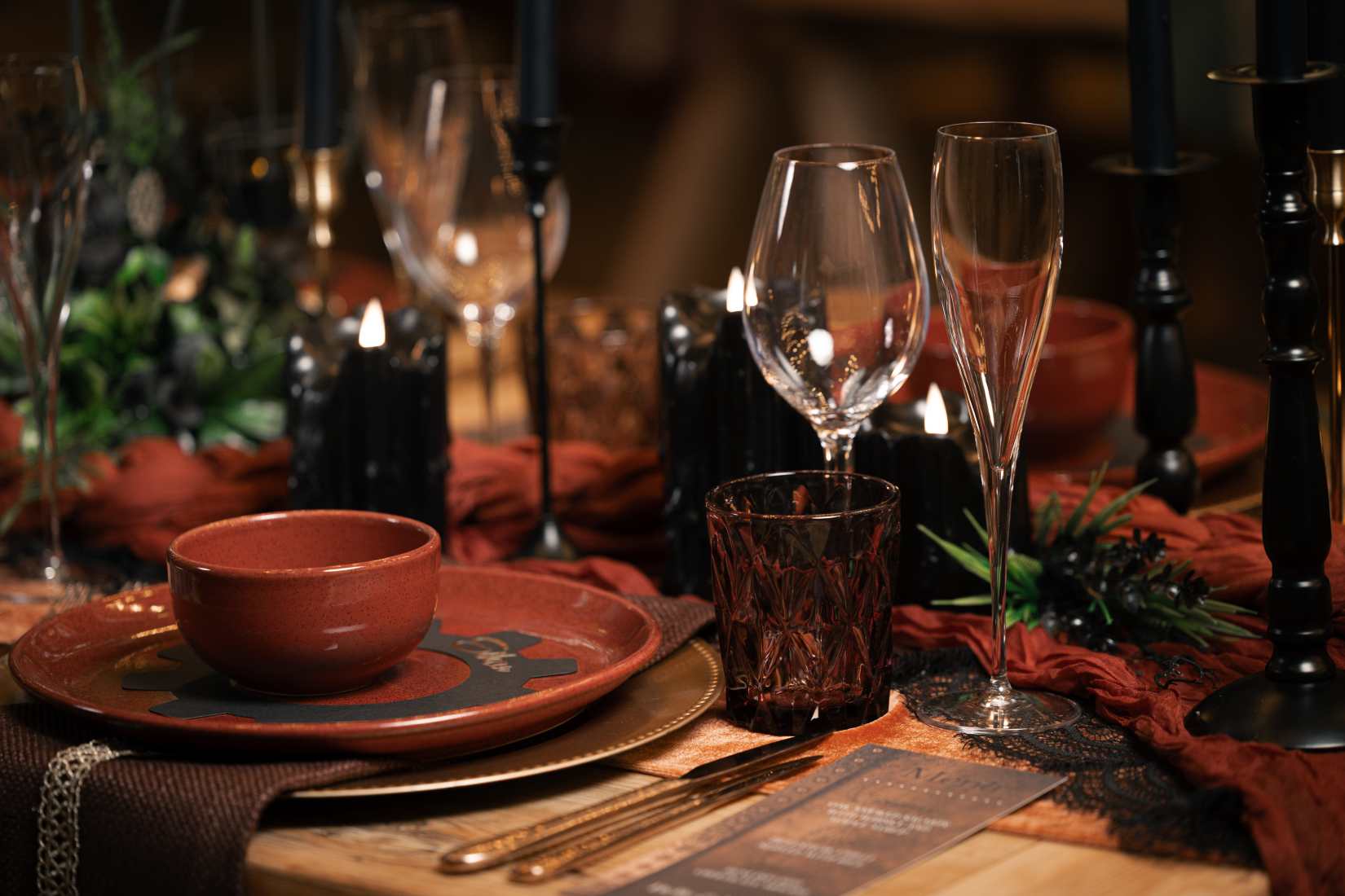 Your table settings should reflect the unique Steampunk aesthetic. Rent ornate silverware, coloured glassware with Victorian flourishes, and dishes that evoke a sense of timelessness. Brass candleholders, vintage candelabras, and deeply coloured linens can bring an air of sophistication while keeping with the industrial vibe.